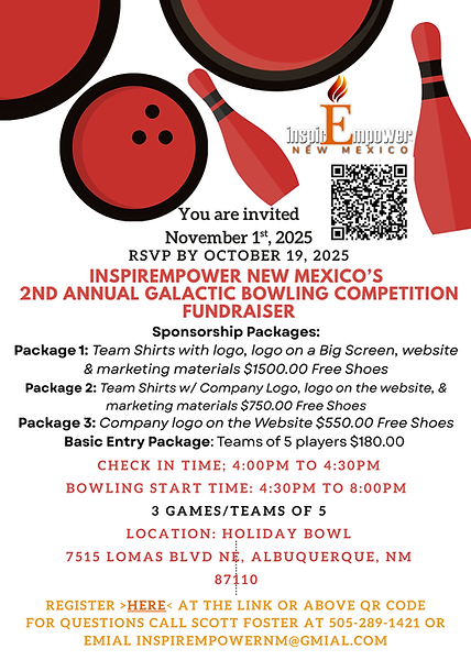 Join us for a good time for a good cause! Come out to our upcoming Galactic Bowling Competition Fundraiser to support the nonprofit InspirEmpower. Proceeds will go towards the organization's mission to support, empower and equip Black and Brown men and women who are transitioning out of incarceration with entrepreneurial focused programs, trainings and resources.
